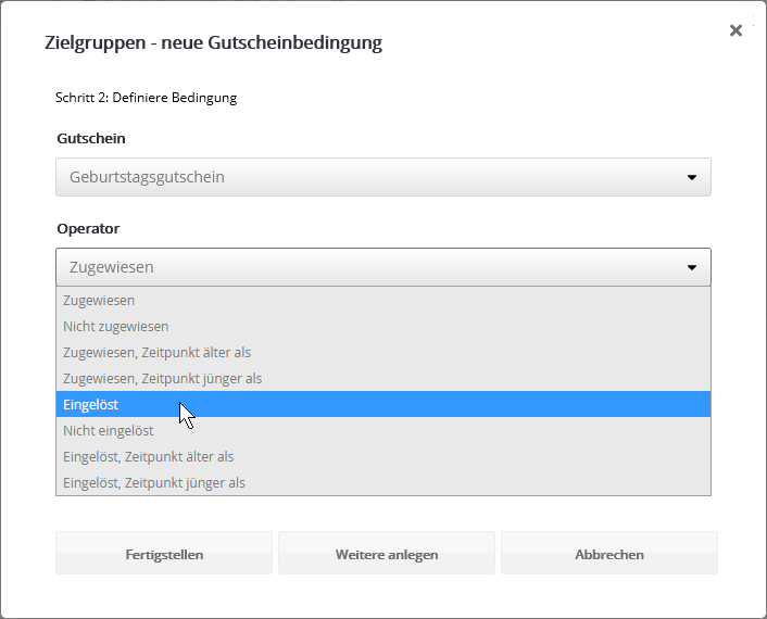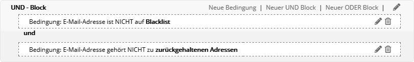 Insbesondere nach dem Kopieren einer vorhandenen Zielgruppe kann das sinnvoll sein, wenn die identischen Abonnenten in Original und Kopie nicht gewünscht sind. Bedingung anhand GutscheinFiltern Sie Abonnenten danach, ob und in welchem Zeitraum die Zuweisung oder Einlösung eines Gutscheins stattfand. Tipp: Um zugewiesene Gutscheine als eingelöst zu markieren, nutzen Sie entweder die Webservice-Funktion 'RedeemVoucherByCode' oder importieren in der Gutscheinübersicht eine CSV-Datei mit den eingelösten Gutscheincodes. Bedingung anhand SelektionMit diesem Bedingungstyp nutzen Sie eine per Webservice angelegte Selektion von Abonnenten als Folio Familie-Zielgruppe. Der Bedingungstyp ist nur dann sichtbar, wenn per Webservice mindestens eine Selektion angelegt wurde. Das Besondere: In einer Selektion werden Abonnenten anhand einer Liste von IDs gruppiert. So lässt sich eine extern getroffene Abonnentenauswahl als Zielgruppe nutzen, ohne dass in den Folio Familie-Abonnentendaten ein gemeinsames Merkmal vorliegen muss. Die Details entnehmen Sie bitte der Webservice-Dokumentation, die wir Ihnen gern zusenden. Bedingung anhand des Empfängers (geplant)Diese Bedingung entscheidet, ob ein Abonnent als Empfänger eines bestimmten Mailings vorgesehen war oder nicht. Das bedeutet, dass er in einer Abonnentenliste bzw. Zielgruppe für ein bestimmtes Mailing steht, welches versandt wurde. Im Unterschied zur letztgenannten Bedingung wird der tatsächliche Empfang jedoch nicht geprüft. Es sind auch alle Empfänger enthalten, die das Mailing z. B. aufgrund von Bounces, Blacklists oder serversseitigen Spamfiltern nicht empfangen haben. Bedingung anhand des Empfangens (zugestellt)Diese Bedingung entscheidet, ob jemand ein bestimmtes Mailing empfangen hat oder nicht. Das Mailing gilt als empfangen, wenn der E-Mail-Server des Abonnenten eine positive Rückmeldung erteilt hat. Im Schritt nach dem Empfang ist es dennoch möglich, dass das Mailing beim Empfänger in einem Spamordner landet. Bedingung anhand des BounceverhaltensDamit legen Sie Bedingungen anhand der Zustellungen oder Nichtzustellungen eines bestimmten Mailings an. Bedingung anhand Blacklist bzw. Zurückgehaltener AdressenAbonnenten, deren E-Mail-Adresse auf einer Blacklist oder der Liste der zurückgehaltenen Adressen steht, werden automatisch vom Versand ausgeschlossen. Dieselben* Abonnenten lassen sich per Zielgruppe filtern, etwa um sie beim Export Ihrer Abonnentendaten ebenfalls auszuschließen. Die kombinierte Zielgruppe sieht wie folgt aus: