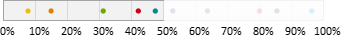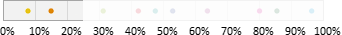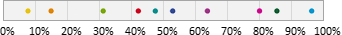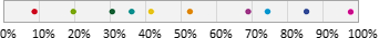 Auswahl-Wahrscheinlichkeit in ProzentGeben Sie einen Prozentwert zwischen 0 und 100% ein. Mit dieser Wahrscheinlichkeit gehört ein Abonnent zur Zielgruppe. Beispielsweise bewirkt ein Wert von 25%, dass ungefähr (siehe Hinweis) ein Viertel aller Abonnenten zur Zielgruppe gehören. Dazu verteilt Folio Familie alle Abonnenten auf einem Zahlenstrahl zwischen 0 und 100%. Bei 10 "bunten" Abonnenten könnte eine Variante so aussehen: