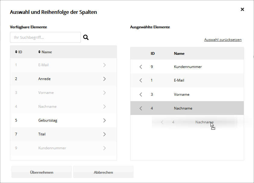 Um den Fokus auf die für Sie relevanten Abonnentenfelder zu behalten, lassen sich die angezeigten Spalten auswählen und in der Reihenfolge ändern. Klicken Sie dazu oben rechts auf den Button 'Spaltenauswahl'.