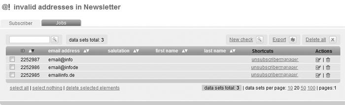 Now the buttons 'New Check', 'Export' and 'Delete all' are available. 'Delete all' removes the invalid addresses completely. 'Export' creates a CSV file containing the invalid addresses, which you may save on your computer and edit manually. 'New Check' makes another examination of the email addresses and updates the number of invalid addresses if necessary. In the overview, the actions 'Edit' and 'Delete' are available.