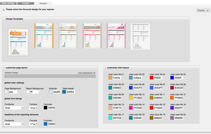 Now you also can adjust the design of your report. Choose the tab 'designs'. By default Folio Familie suggests you six different layouts. HTML experts can also open the 'advanced settings' below the layouts to edit the html-code. For example you can insert your logo in th header.