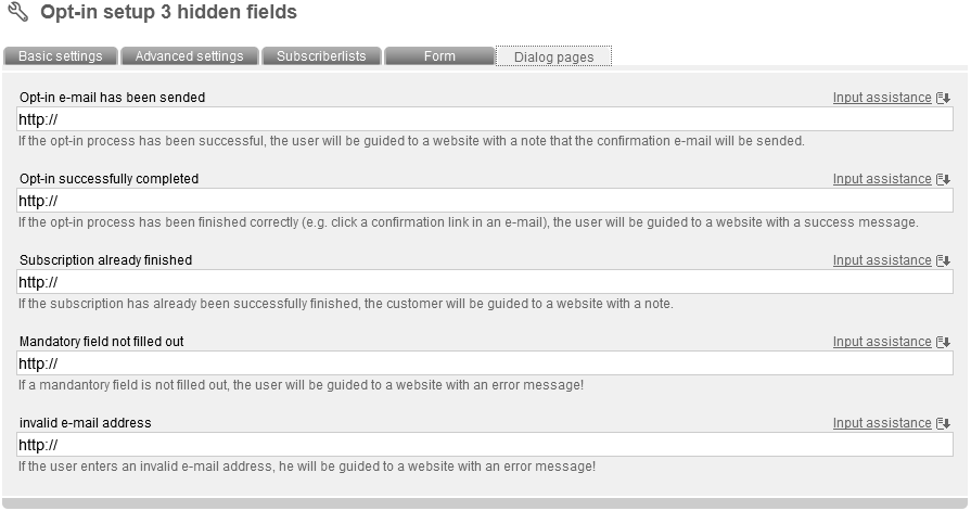 Now enter a name and an optional description for your optin setup. Then choose the 'mode' (important). The following modes are supported by 'Folio Familie': Double Opt-in with confirmation e-mail (recommended as the only legally secure login variant): Interested party visits a website with an optin setup form. He enters his data into the form. He gots an e-mail with content like this: „Thank you for your optin. Please confirm the registration confirmation link to complete your registration.“ He clicks the link. Registration is completed. He gots a „welcoming“ e-mail. You can integrate information about your company and a certain design as well. Double Opt-in: Like described before, but without sending of a „welcoming“ e-mail. Confirmed Opt-In: Nach Anmeldung auf der Webseite wird sofort eine automatische Begrüßungsnachricht versendet. Single Opt-in: No e-mails will be send. There just will be a message in your browser, that registration was successfull. According to the mode you've choosed, you have to adapt different sub-options. In Tab 'advanced settings' you can deposit your e-mail address in field 'e-mail forwarding', to be informed about new subscribers. In field 'mailing for later delivery' you can determine your last sended newsletter. All new subscribers will receive your last mailing and don't have to wait for another one. To protect your optin-form against abuse, activate the invisible captcha . Captchas are often used to check if petitions are produced by a machine (robot, short: bot) or a real person. Bots are often used abusive to generate masses of subscriptions. Choose your favorite subscriberfields, which should be filled in in next tab 'Form'. After clicking 'Add subscriberfield' a pop up appears, where you can select and add subscriberfields to your optin-form. Furthermore you can add one or more subscriberlists as option(s) in a ceckbox through the button 'add subscriberlist'. Click 'sort formfields' to edit order of your fields. Click 'test form' to check your form by a preview of your optin-form. Next tab: 'Dialog pages':