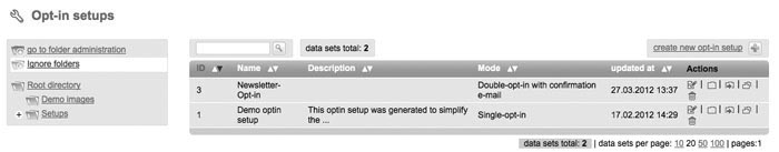 Through 'Setups' and 'Optin Setup' you can create forms, which can be included into your website. So interested parties can login automatically on your website for your subscriberlist(s). Please note: Requirement for a successfull 'optin setup' is to create an e-mail with type 'dialog mailing' for registration confirmation and welcoming, which got the status 'activated'. Otherwise those mailings will be lacking in the shortlist of mailings which you can choose for your optin setup. For an esier start Folio Familie gots a „Demo optin setup“ for you. Created optin setups can be 'opend' afterwards for editing, 'moving' to another folder or 'deleting'. If you have moved an optin setup into another folder, click 'open folder' to get into. Create new Optin setup |