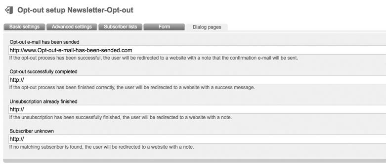 Enter a name and an optional description. Choose the 'mode' (important). The following modes are supported by 'Folio Familie': Double-optout with confirmation e-mail: after unsubscribe from your website or your newsletter a confirmation email will be send automatically. Optout will be activated after clicking the confirmation link in this email. After successful unsubscription the former subscriber will get a last email („You unsubscribed successfully of our newsletter.“) Double Optout: Like described before, but without sending of a „successful unsubscription“ e-mail Confirmed Opt-Out (recommended): After unsubsubscription on your website or in your newsletter a „successful unsubscription“ email will be sended immediately. Single Optout: No e-mails will be send. There just will be a message in your browser, that optout was successfull. In Tab 'advanced settings' you can deposit your e-mail address in field 'e-mail forwarding', to be informed about unsubscriptions. Tab 'subscriberlists': Choose your favorite subscriberlist(s), where all unsubscriptions should be logged out. Select the subscriberfields, which should be filled out by your subscribers in tab 'Form'. After clicking 'create form fields' a popup appears, where you can choose and add subscriber fields to your form. Click 'sort formular fields' to arrange your fields. Click 'test form' to open a new tab in your browser with a preview of your form. Source Code of your website is genereated by 'Folio Familie' by clicking 'Formular soruce code'. A popup appears with your source code. Last tab: Dialog pages |
