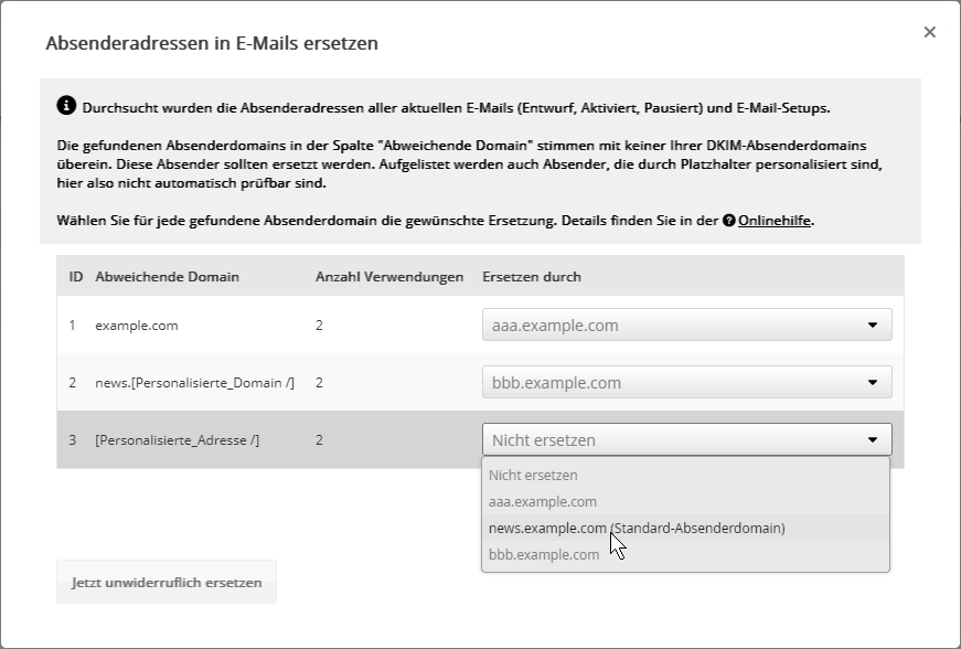 - Ersetzen veralteter Absenderadressen in aktivierten Mailings, die noch keine Ihrer konfigurierten Absenderdomains verwenden