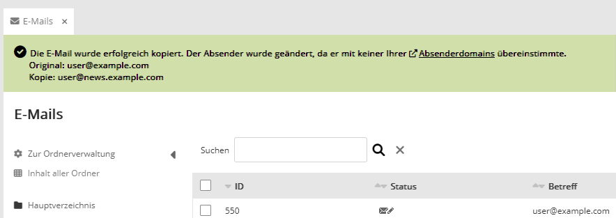 Verwendet die Absenderadresse des Quell-Mailings keine Ihrer aktuellen Absenderdomains, wird in der kopierten Mail automatisch die Standard-Absenderdomain eingesetzt. Eine Infomeldung zeigt die Änderung an, so dass Sie den neuen Absender prüfen können (und sollten). Das betrifft auch das Kopieren eines Archiv-Mailings.